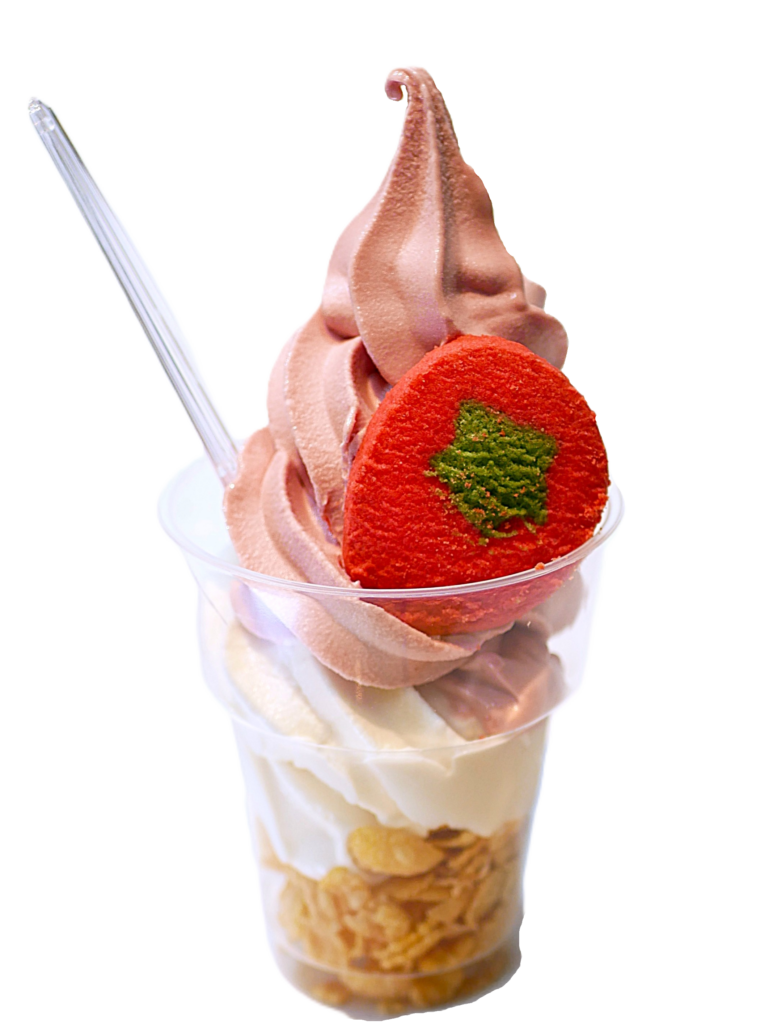 みはまの市場限定販売の「おもいっきりいちご ソフト」 税込550円(ハマベリー果汁100%のいちごソフトに濃厚バニラの組み合わせ)